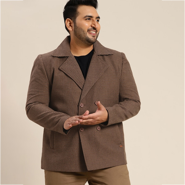 Brown checked double-breasted overcoat, has a notched collar, regular length, button closure, 2 side pockets, 1 inner pocket and an attached lining